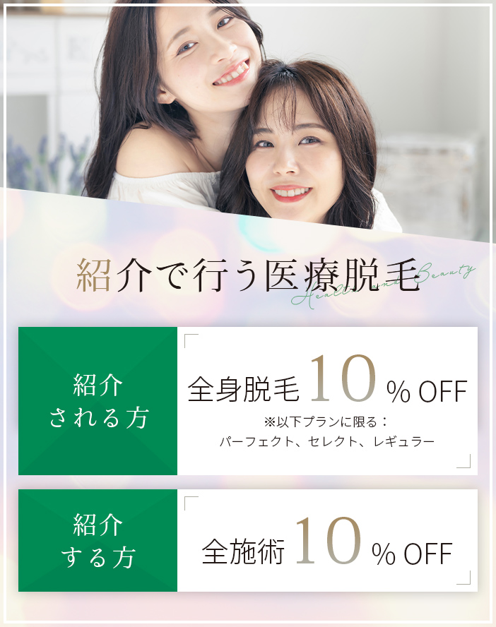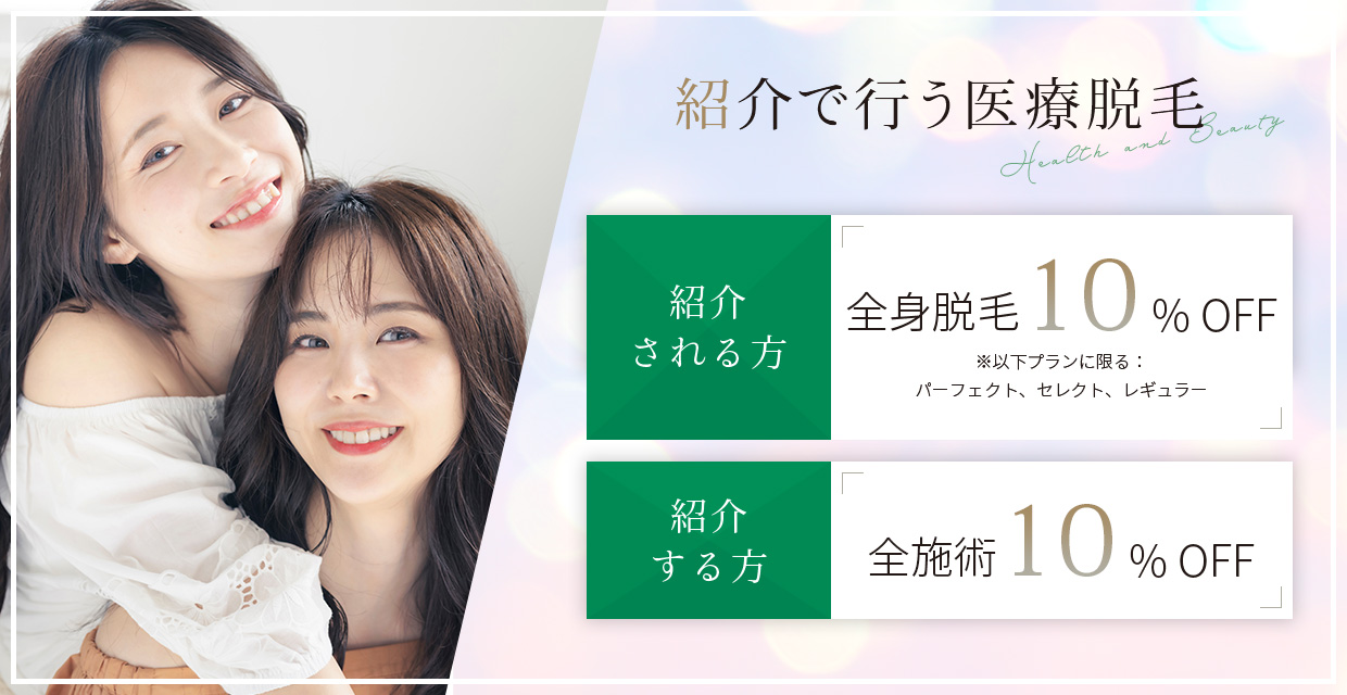 - 紹介割適用のプランは、全身脱毛パーフェクト・セレクト・レギュラープランに限ります。